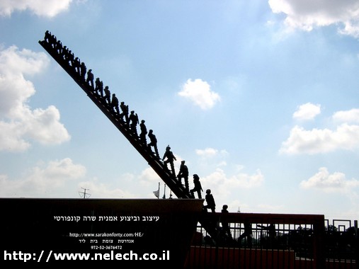 בניתי אנדרטה זו עם הרבה מאד יראת כבוד, עבודה פיזית על אנושית ותקציב מינימאלי – 22 דמויות העולות על סולם כלפי מעלה, הולכות וקטנות לזכר 22 החיילים שנרצחו בצומת בית ליד על ידי החבלנים. את החומה הוסיפה הארכיטקטית על דעת עצמה ולמרות התנגדותי ותכנוני המקורי שהוסכם עליו בכתב עם העמותה.